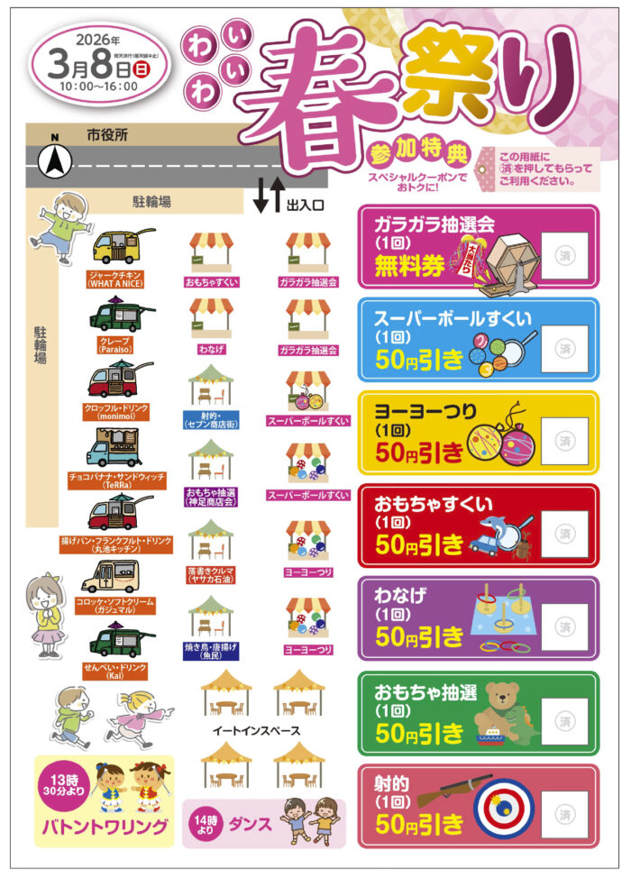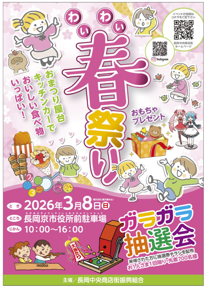 ホーム未分類2026 わいわい春祭り 長岡中央商店街振興組合の2026 わいわい春祭り 長岡中央商店街振興組合の2026年わいわい春祭りのチラシとポスターを制作させていただきました。ターゲットは保育園児から小学生の楽しいイベントです。私もおもちゃ抽選会のスタッフとして参加しますので、遊びに来てくださいね!